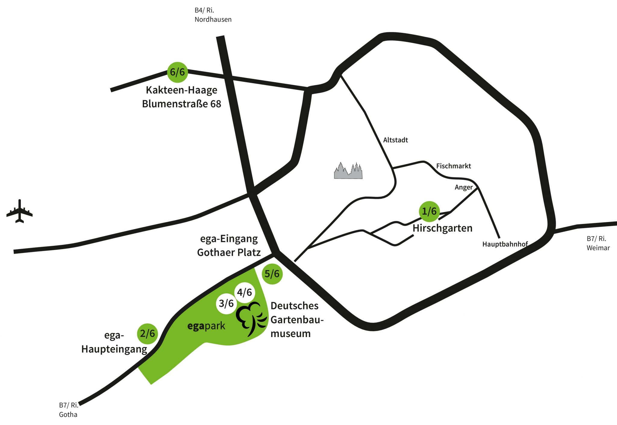 Weitere Stationen: Vorplatz egapark, Vorplatz und Innenhof Deutsches Gartenbaumuseum, Gothaer Platz, Vorplatz Kakteenzucht Haage